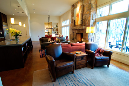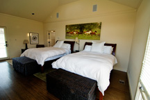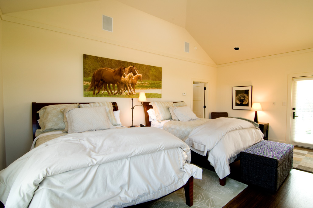 Just past the horse barn and pastures is the Inn at Sandy Creek, a bed and breakfast accommodation named for the water course that bisects the property. The Inn is nestled in a grove of trees across from one of three lakes located on the property. The inn features an elegant great room, which Lisa furnished with direction from famed designer Jeffrey Weisman. The great room opens into a large gourmet kitchen where breakfast is served each morning.